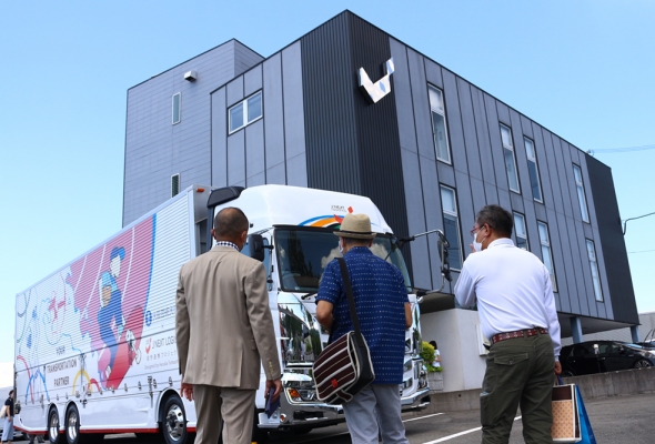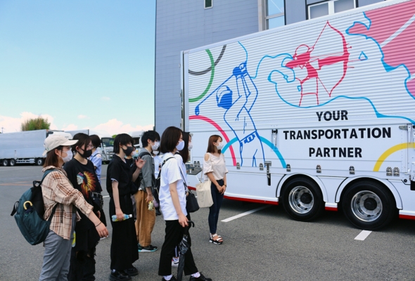 今回は新型コロナの影響により通常よりかなり日程がずれ込みました。また、生徒さんたちにも感染防止のためのマスク着用と三密を避けた形のバスでの訪問となりました。梅雨明け当日の炎天下の中、すでに完成されたトラックデザインに生徒さん達が囲み弊社社長が磨き上げたデザイントラックを直に見て触れていただき、デザインの要となる事柄の説明をさせていただきました。