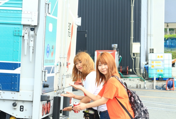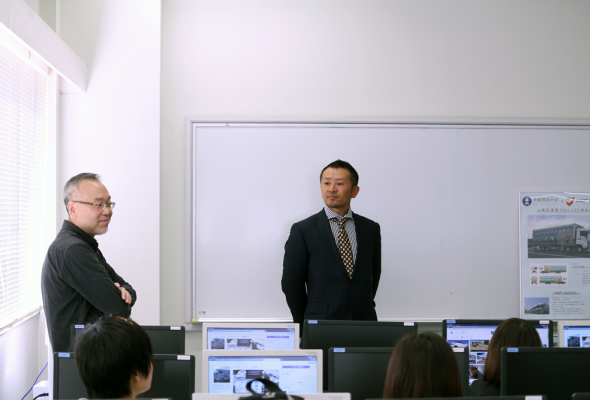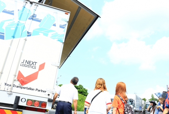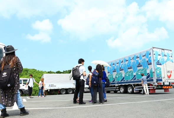 学生の皆さんは実際の大きさに少し驚かれた様子ではありましたが、目をキラキラと輝かせて積極的に質問や写真を撮り、熱意に溢れた様子でした。この中の学生さんのデザインが来年には最優秀作品として選ばれ、トラックに印刷されて日本の何処かで物流の要となります。