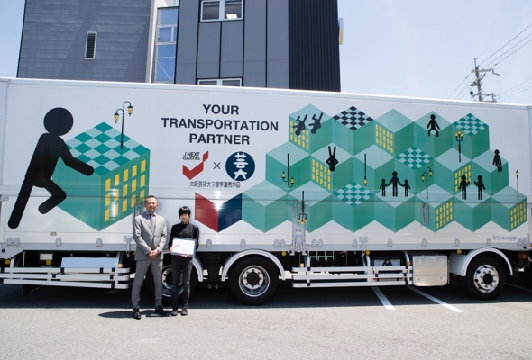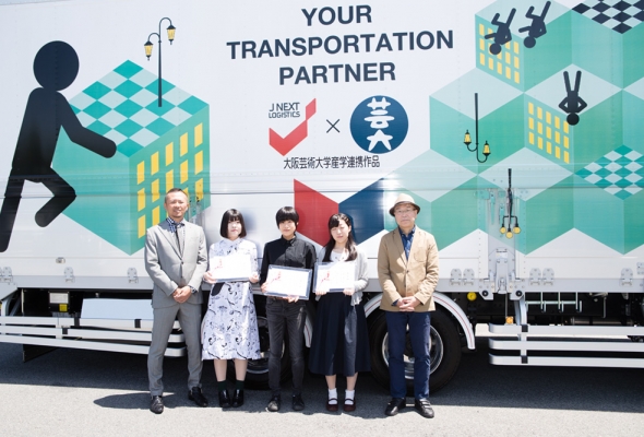 この度、弊社ジェイネクストロジスティクスと大阪芸術大学は産学連携プロジェクトとして、弊社トラックへのラッピングデザインを大阪芸術大学の学生の方々にご依頼をさせていただきました。いつも地域の皆様に支えていただいている弊社ですが、この南河内郡を、弊社を、もちろん大阪芸術大学さんをより知っていただくために、今回の産学連携プロジェクトを始動いたしました。