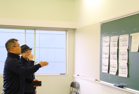 12月7日、大阪芸術大学のデザイン学科学生さんのデザインラフ案の第一弾を拝見しに紅葉に染まる木々が美しい大阪芸術大学に訪れました。皆さんの素晴らしいデザイン案がホワイトボードに並び、それぞれ三つの案を提示いただきその中から進めるデザイン選定を行いました。