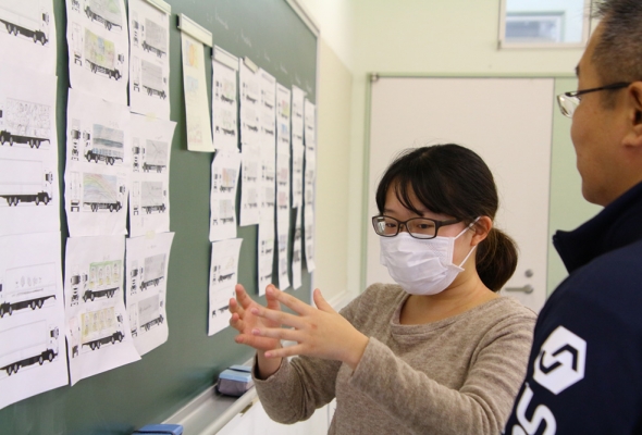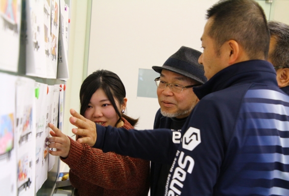 年始の大阪芸術大学での学生さん達の最終プレゼンテーションの内容をじっくりと伺った弊社スタッフが、作品全てのコンセプトや学生さん達の“想い”を充分に伝える場となりました。年々デザインの決定に時間がかかってきております。それは担当の先生や生徒さん達が弊社の取り組みやデザインコンセプトへの理解が深まった故だと思います。